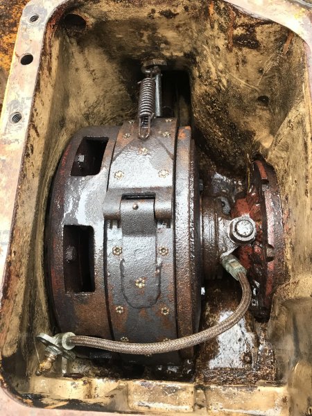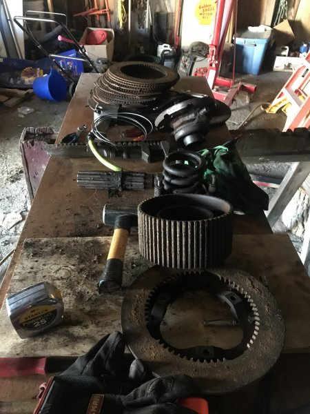 Disassembled the clutch including the 1500 lb spring! Gently with the help of my floor jack and a tractor drawbar. The other clutch is free and ready to lift. Still need to disassemble the brakes. Unfortunately I ran out of gas for the day.