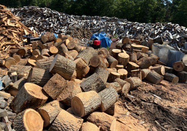 The poles from the 4 semi loads are all cut up now, including the 2 pine logs he snuck in there. Have a bunch of rounds staged for each splitter.