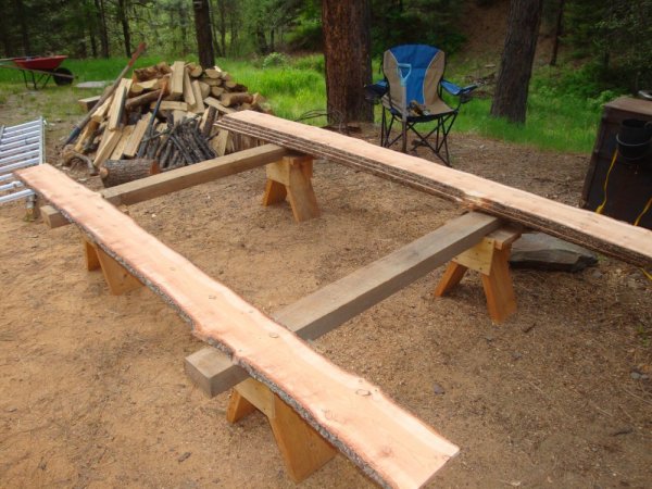 Well, didn't get any logs down off the hill yesterday. Spent the afternoon just futzing around and cleaning up around the place a little bit. I have some big ponderosa pine trees in front of my porch that are a blessing and a curse. The shade is nice in the summer, but the amount of needles and cones they throw off is a minor pain. Raked up a bunch of needles and cones and threw a pitch fork full into the weber kettle every half hour or so. Now I'm ready for some more milling. Just waiting on my neighbor now. He's gonna use his 4wheeler to make the skidding a little easier.