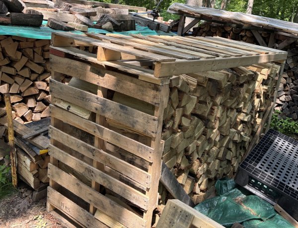 That’s a wrap on this particular score. Just about 2/3 cord of black locust. All that’s left to do is secure a tarp to the top of the makeshift pallet roof. It’s a pretty solid rack between the 45 degree braces and 8’ pallet roof tying everything in end to end. Underneath the black industrial mats are all the red maple splits. I can add to this short pile later this summer if I get more red maple. The little bit of pin oak from the beginning of this thread. I still have to find a permanent spot for it, but for now it can sit where it’s at. A little less than a cord all said and done, so not bad for hoarding during my off-season. That brings me to about 14 cords total at the house, which is a good number for me.