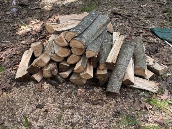 I broke protocol again :whistle: There was some roadside tree trimming near my work recently and the wood was pushed down a bank and left behind. Honey locust, a species I’ve only scored once before. Heavy and dense, which makes it excellent firewood. As per my usual quick scrounges, there’s not much there, the end cuts are crooked and it’s at weird lengths, but I’ll take whatever HL I can get regardless.