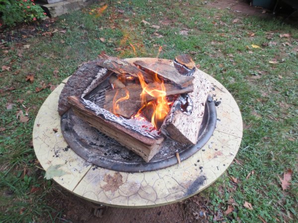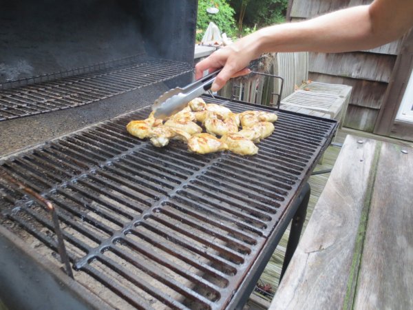 Temps in upper 70's with dewpoint in low 70's so a sticky damp day with rain this morning into the afternoon. Buggy chunks and bark in the firepit. Chicken wings (for buffalo wings) on the charcoal.