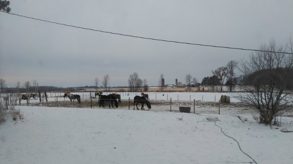 28 out, some snow coming in tonight, hoping more on the 1in And not the 3. 69 inside, had some breakfast, now I'm doing some dishes and cleaning the kitchen up some before I go cut some wood and do chores. My view for doing dishes.