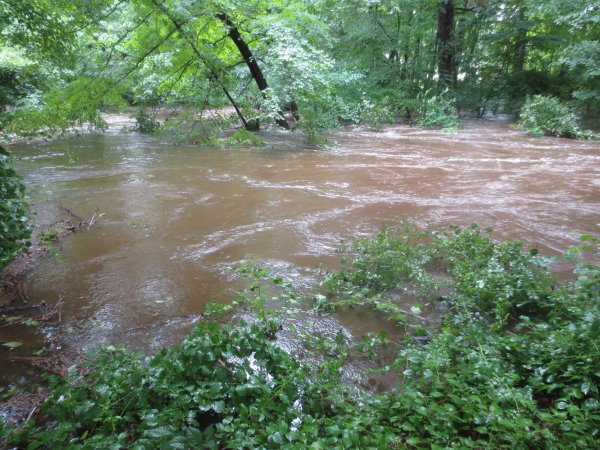 High of 80 and an even mix of clouds and sun with typical Summer feel. Everything is pretty damp from the 6"+ of rain we got from tropical storm Elsa yesterday. The river below was the highest ive seen in 14+ years she has been here. It partly flooded the driveway down below. Our house is up on a hill so safe from flooding. Flash flood warnings yesterday in my county. Pic of river right next to my old processing area down below. The water is normally several feet below the bank and it was a foot from the top of it. It had receeded a bit when i took the pic. IMG_5317.JPG