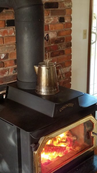 Temps in the mid 40's this AM. About 3 in the morning, for some unknown reason, power went out for about 1500 customers in our area. Started a fire and added some bark. Got the percolator stored in the camp chop box and started coffee. I had 2 ham and cheese sandwiches left over from hunting yesterday so the Wif toasted them up in a pan on the wood stove. Hot coffee and toasted ham and cheese in front of the stove is not a bad breakfast. poweroutcoffee.jpg