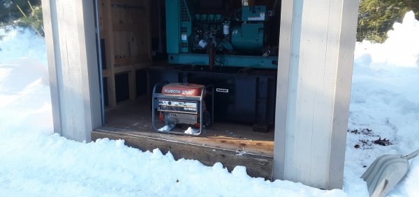 The little gas genny is backup if I failed to plug in the block heater before the power goes off. It's easy to start and will preheat the main generator.