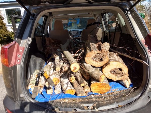 A freaky 78° today, sun and clouds, but crashing back to the 30°'s tomorrow. All kinds of snow and freezing rain coming, too. But today, it was almost too hot to split! Dump is picking up, found some birch and a couple chunks of apple.