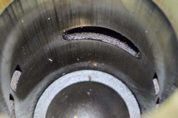 Some internal pics after I timed the ports with the timing wheel. It's an odd layout. The exhaust port is offset to one side as are one pair of transfers. Those vertical lines in the cylinder are not scores.