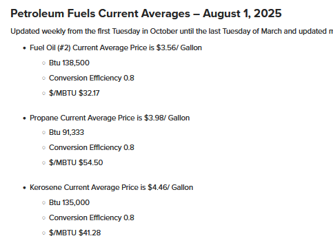 We just took delivery of 14 gals of LP. $6.80/gal. LP is used for DHW and cook top. If we used more, it'd be less per gal.