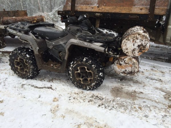 Yep state cutting area Yep got snow on September 30th Last day of my wood cutting week I had a few big trees down and bucked up from the nice sunny day before Next day I wake up to 3 in of fresh snow on the ground and and at least a cord bucked up laying on the ground 100 yards downhill from the truck road just waiting to be hauled out And I thought well better get it before some one else does (and that's when the seeds of madness were planted) Getting traction was tricky had to get some weight up front to hold the front tires on the ground Only got 1 cord that day lol All most forgot the most important part of setup Kenai holding our dinner lol