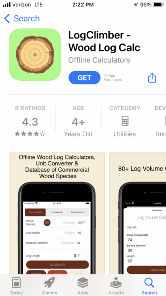 I am on Android. It is called Timberlog. If you get it and have trouble, I can talk you through it. It calculates 'solid wood' volume. Not stacked splits volume. The "ft" is length of the round or log. I split to 16", so, if it's a round, I enter "1.333" for "ft." The "in" is for "inches" and it means diameter. The next blank is left to "1" if it's just one piece but if you have more than one piece the same size, you can enter "2" or whatever. Then it calculates the cubic feet of that piece. It keeps a running tally of the "session." You hit the "+" sign to add to the tally.