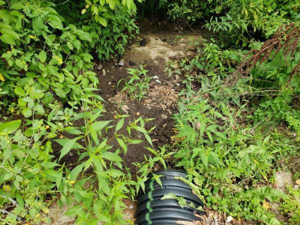 The catch basin from the "swamp" nest door just has some moist ground - no water. This is usually full and draining down the bank (the drier area toward the top of the pic) into the drainage area on my property. The depth isn't apparent in the picture but the basin is a good 2' deep The water source on the opposite side of that property is still flowing a bit - can't see it but I could hear a faint trickle.