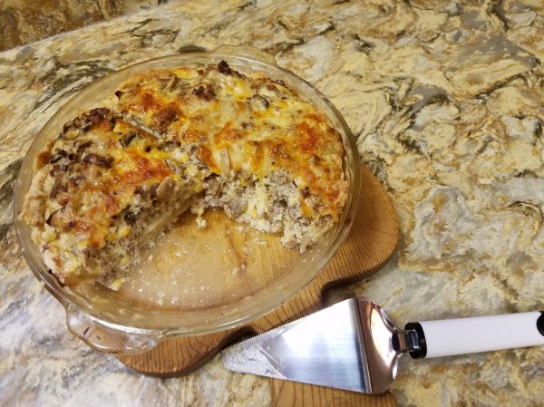 Venison sausage pie (quiche) Wif made last night. Used venison patty breakfast sausage, onions, mushrooms, egg, cream and two cheeses in a pie crust. Don't know the specifics because she just throws things like this together. I imagine any good quiche recipe would go well with the breakfast sausage. I honestly tried to get a picture before the chow hounds got at the pie but was not fast enough. Not a lot of contrast between the countertop and the pie. I once set a plate of scrambled eggs on the counter and we found them 3 weeks later!