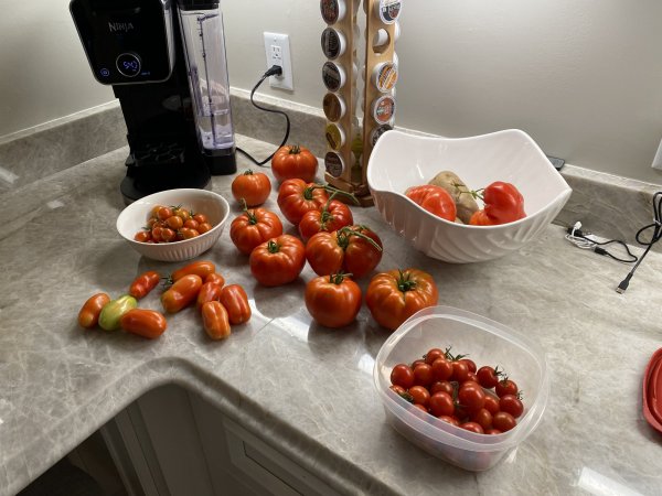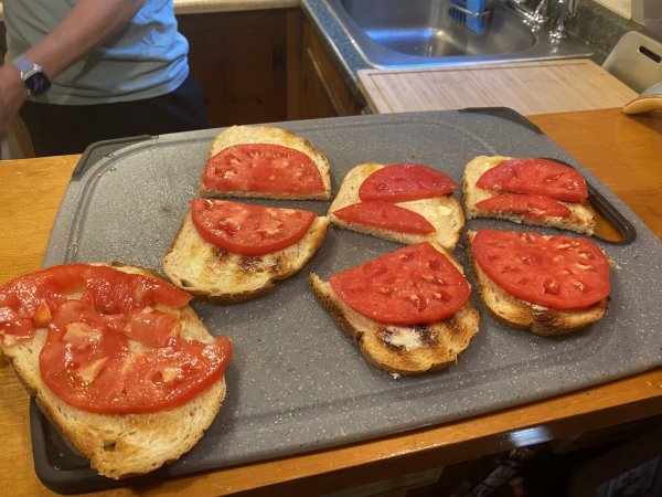 Tomatoes are coming in good! (From our CT garden) Brought some up north and had a few with breakfast this morning: