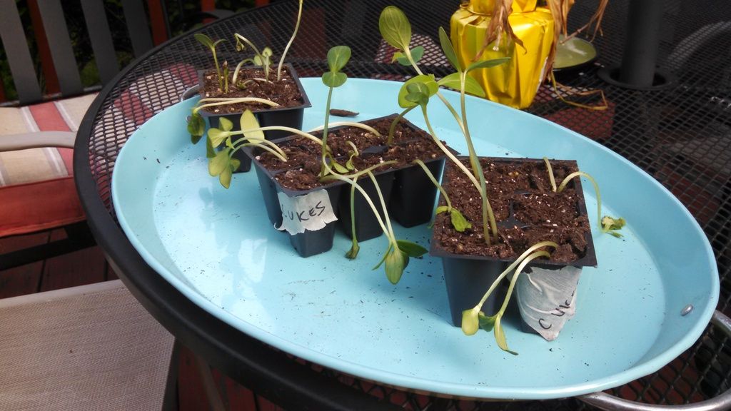 Cukes are 'hardening' by bringing them outside during the day only. Then this happened. Why? Tomatoes haven't been outdoors, but are starting to get limp and scraggly. Why? I only water when the soil starts to feel dry at the surface. I might have to stick with just murdering trees as I suck at this growing stuff thing.