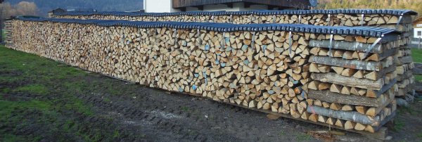 Meterholz stack with weather-beaten covers made of PE. UV protected – almost indestructible. My long term testing stack. As you can see, we built crosswise "towers" at the ends of the stack and fill the space between. This is quick and good for seasoning too. We turn the narrow side of the stack into the main wind direction.