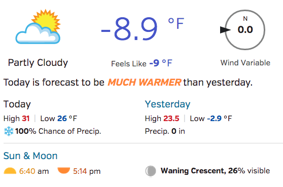I don't remember it ever getting this cold here I don't see how today's low can be 26ºF when it is -9ºF right now at 7:30AM Hi/Lo must be day/tonight Sunday night is supposed to be even colder eesh Emptied the wood bin outside the door last night so gotta fill that back up this morning. Or wait for it to warm up a little. LOL