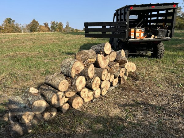 I was hauling a load of rounds home yesterday and some dude followed me into my property entrance. My Glock was at the ready. As he approached me I felt at ease as I noticed his age and stature. He said he had seen me hauling longs many times over the past year and wanted me to clear a few dozen downed trees. I met him later on his property and estimated about 10 cords worth of hickory, hard maple and white oak. Started cutting today. A lot of cutting involved to get to the good stuff.