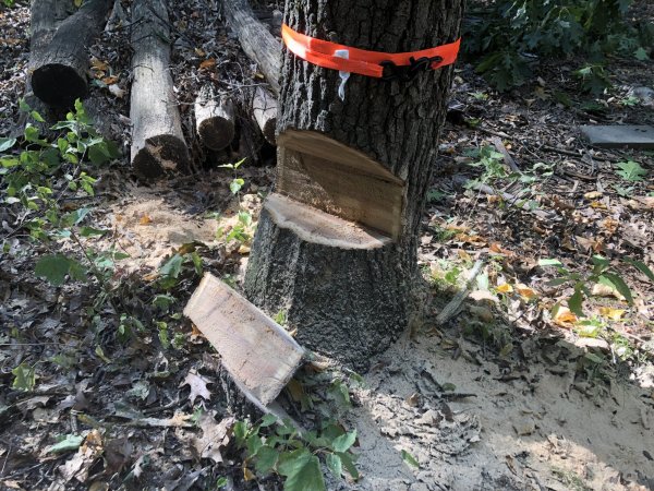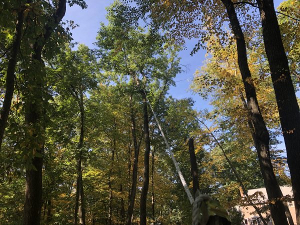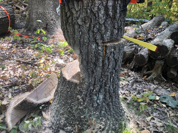 So to further elaborate on the Maasdam, I recently took down the tree in the picture.. Yes. The lean was as bad as it looks. I did a very open face cut. Idea was to maintain a hinge as long as possible. I tied off with two ropes in the big crotch that was 2/3 of the way up the tree. This is when I already had started pulling This is the view from the first pull point. This is from the second pull point. If the rope started to rub on that tree, I planned to put a pulley on the rope and pull it away from the tree to prevent friction damage. As you can see, the back cut opened up quite a bit and the hinge allowed it to stay attached. And here is the resulting stump when it finally came down.