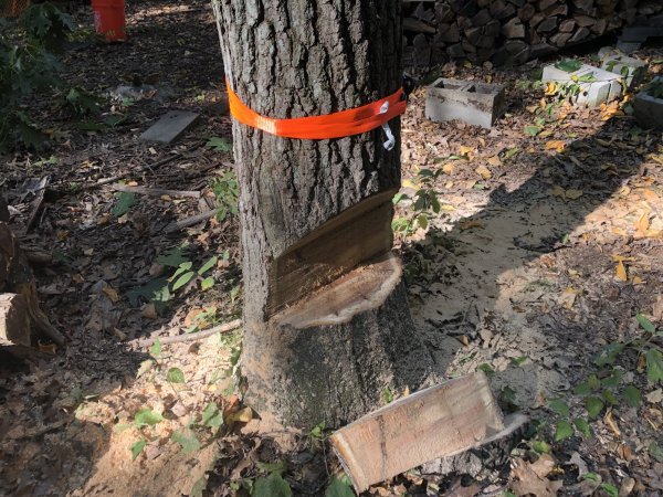 And put a ratchet strap around the base of the tree about a foot above your cut. So if it was to barber chair on you, the ratchet strap would hold it together.