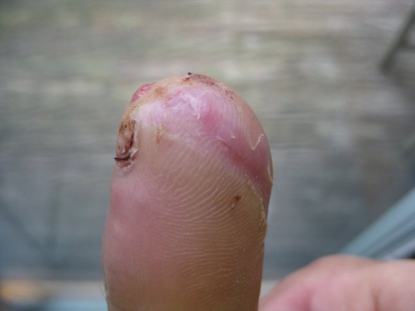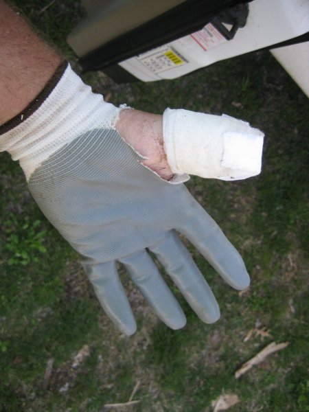 Ouch! Wasn't as bad as yours but years ago I was working under a pickup and the wrench slipped and pinched the tip of a finger between the wrench and frame. I knew it hurt because I couldn't swear. Crawled out and looked and the tip was dangling by a flap of fingerprint. Went to bathroom washed it up paper towel and electrical tape. To my amazement it took and healed back on. A guy I knew years ago lost the 1st joint of his middle finger in a combine accident. To make it appear less noticeable after it healed up he had a nail tattooed on it, actually did a good job hiding it. Heal up fast.