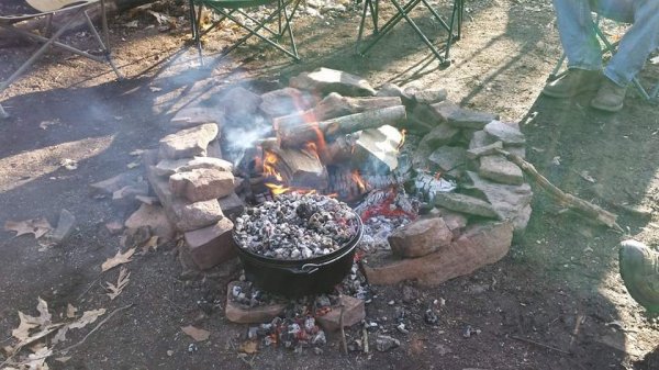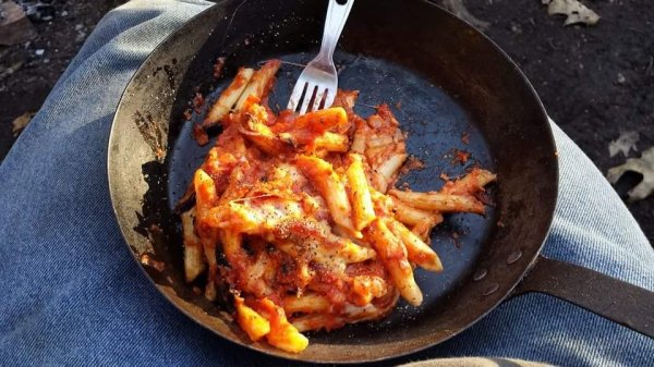 How about my campfire lasagna? Did it back in April in a Dutch oven at our spring Scout Camporee. We whipped it up with haphazard ingredients we collectively had in our coolers. Penne noodles, capicola, mozzarella, provolone, garlic and spaghetti sauce. It was really good too!