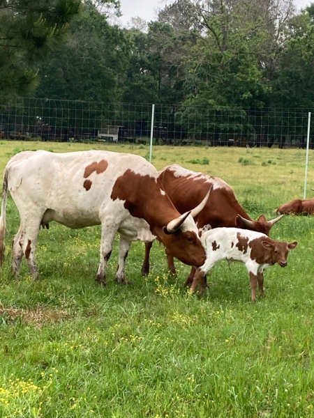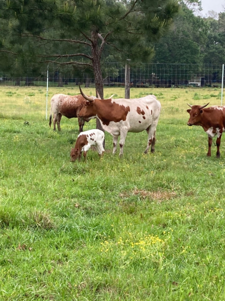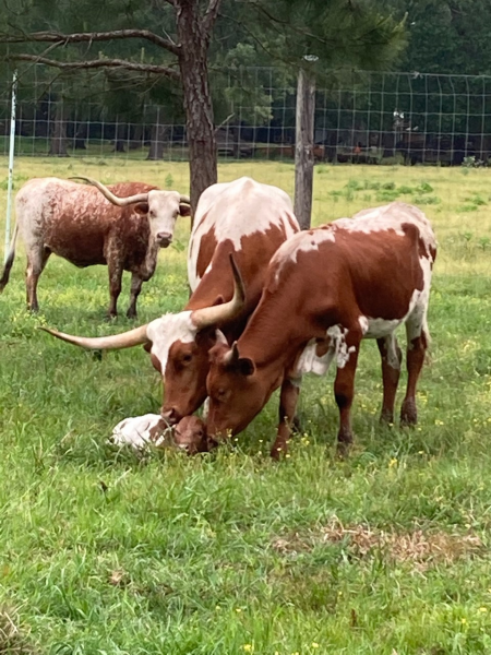 My three year old Longhorn delivered her first calf this morning. The girls are checking it out, I can't get close enough to the little one to determine if its a heifer or bull calf.