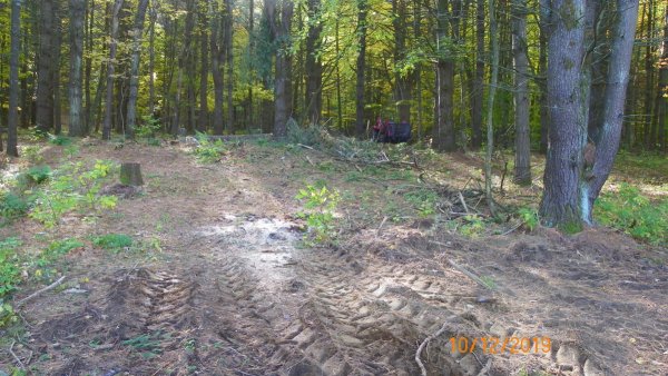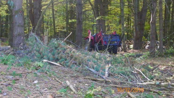 I used the 4540 with the forks and I took two trailer loads of pine branches and downed pine to the wood dump. The area in front of the 4540 down to the dirt is opened up for a tractor or UTV trail. This area will be used for snow storage so our driveway doesn't get narrow down on that end if we have a a lot of snow.