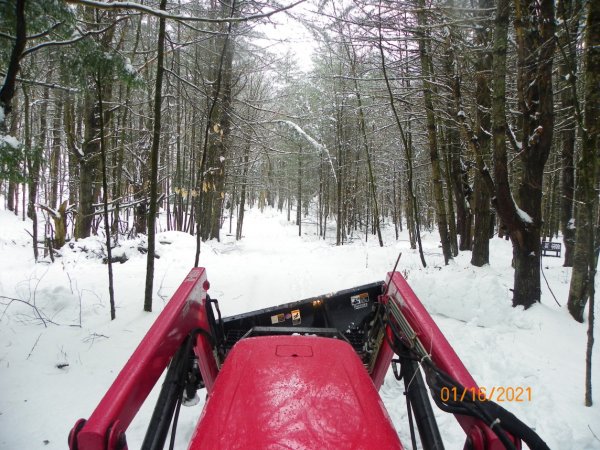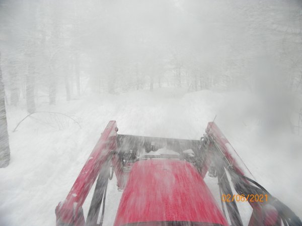 With the two days of snow we had, we only received 8-9 inches of sugar snow. Today I plowed our driveway and the neighbors, he also will be running low on wood in another two weeks so I put the forks on the tractor to fluff up some of the wood frozen in under the snow.