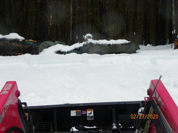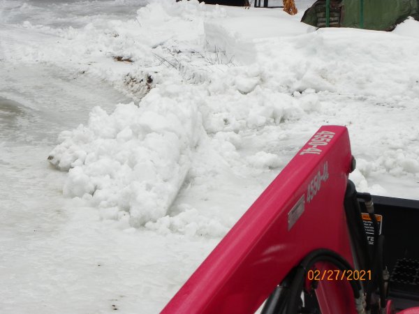I didn't grab the camera but since the sun has been strong the area that has a natural drain which goes from the eastside and runs into the woods on the northside was slushed up good so I plowed out that area and some snow in the area where the pallet forks and bucket are. I started doing this about three weeks ago so it's pretty much ready for any rain we get or any new snow. I'll still keep the slush cleaned out of that area.