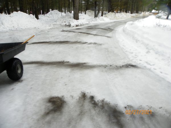 I pushed more water and slush out of the natural drain area later this afternoon. We had a combo of snow and sleet this morning with it turning over to rain. The driveway is pretty much all ice so after clearing the natural drain area, I took the tractor with the trailer and moved a metal garbage can full of ashes from the woods to just off the driveway halfway down. After doing the above, I grabbed a small metal garbage can with some pellet ash in it and did the driveway except for near the top where I put some sand on it. I'm saving the tube sand for the 3 point sander on the tractor for when the temp really warms up, I'll use ashes until then. We're in for another warm day tomorrow so I pulled some snow away from some wood we planned on burning this year, we'll be putting in a few smaller loads tomorrow.