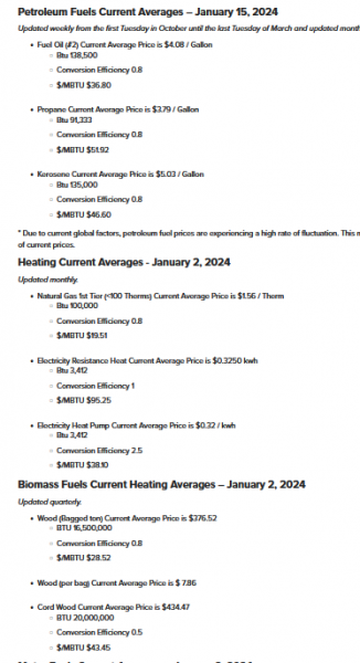Well, for the last several months it has been cheaper per BTU to use my mini-split on the main floor. Now it looks like pellets are the way to go. Just in time - as we're having some pretty cold mornings (5* this morning so far) and I've got the P43 on duty. IIRC, oil was down to $3.89 a month or so ago, but now is showing more. Propane cost me way more than shown in the snip below since I don't use enough.