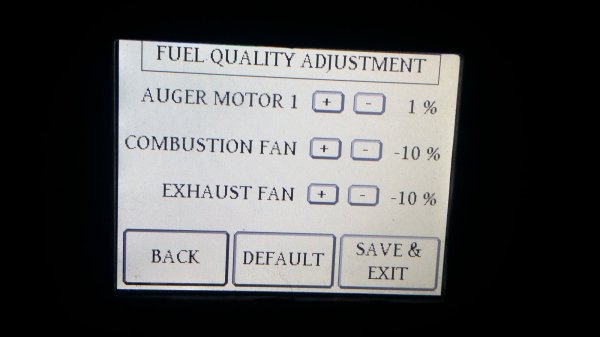 I run my Enerzone at -10% combustion blower / -10% exhaust blower / +1% auger.