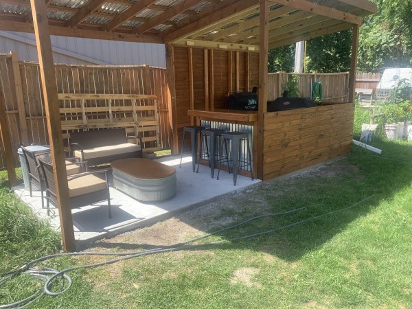 Well I got the stain 99% complete today the picture was before I finished the staining project. I worked until it was dark out but I can get a pic in the light in a day or two of the finished product. It’s almost complete. Definitely one heck of a grill area! I’ve got the Smoker, Gas grill and Charcoal grill out there and soon the blackstone might be added to the kitchen. We may add a sink yet I have a bit of measuring to do before I figure out that part. the sink is turning into a little bit of a challenge… If I can find one I’ll add an outdoor electric deep fryer but that’s also a tad elusive. Most that are outdoor rates are propane.