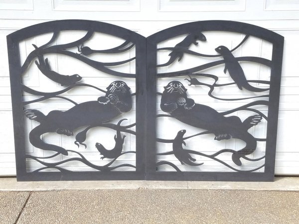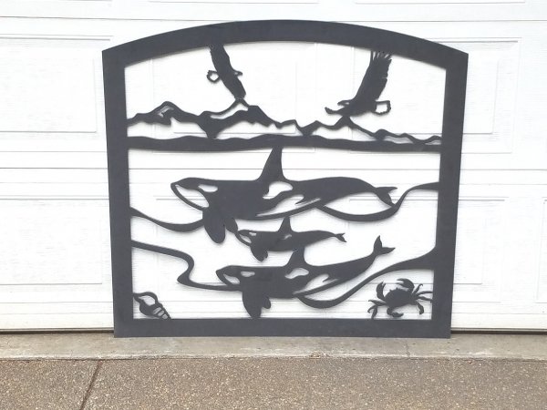 Cut a couple of gates today. They live on the water on Puget Sound and wanted (after many trial drawings) otters in kelp with 5 babies and whales with 2 eagles. I guess the eagles are the gal and her husband and like wise, the otters are her and her husband and the baby otters their kids. Drawn to the customer specs. Seems a bit stilted to me but oh well, whatever makes the customer happy! Cut out of 3/16 steel, 40" X 40" for the whales and 60" X 40" for the otters. Gates will be galvanized because of the nearby salt water. Actual fab and install of the gates are by friends of mine who have a small fab shop. Keeps me in walking around money I guess!