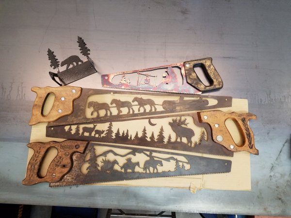 The high country tree and cowboy are from some other drawings I did which I thought I could adapt here. Thanks, the tree did work out well. I posted a picture to a friend that I am going to do a yard art sale with. He does junk art where they combined old tools and parts into whimsical figures and creatures, he rushed right over with a bundle of old hand saws that he had gotten at estate sales over the years so I have plenty of saws to work with now.