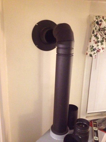 With the top vent and increased height of the new stove I'm running into trouble making the double wall stove pipe coming off the new stove top vent meet up with the outside flue on the right rear wall...