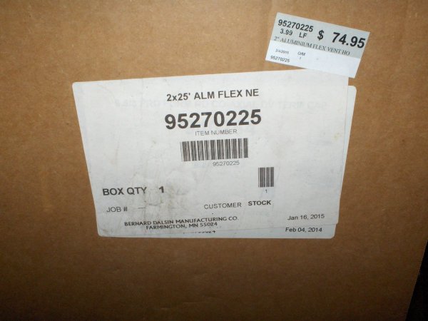 Pic 5 is the (saved) original box the 2" aluminum flex pipe came in. purchased at Ace Hardware (Hamshaw Lumber, Keene NH).