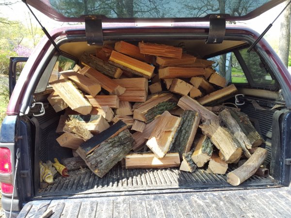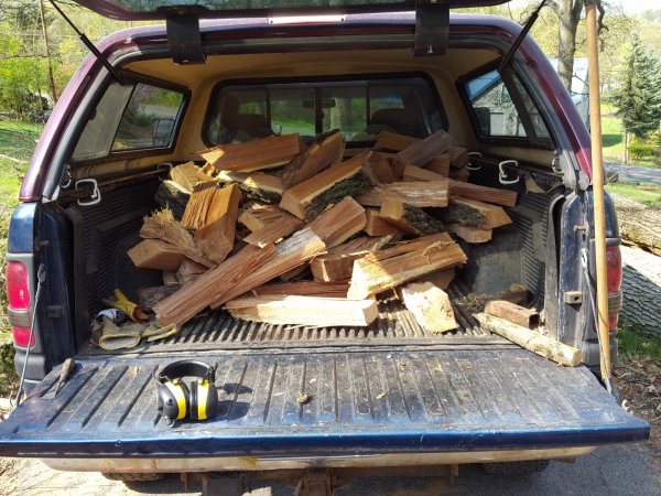 2 more loads of red oak today. I have 2 of the three trees done Only 1 pic though....im tired Can't remember if this was 7 or 8 rounds. Either way, the truck rides nice with a full load on