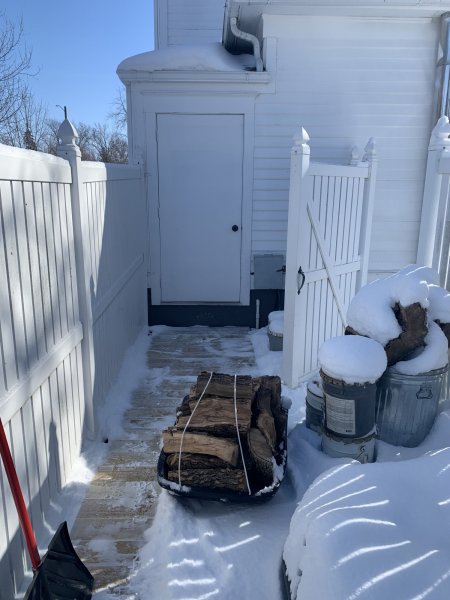 From stacks at our alley thru the back yard, couple gates, to the wooden walk and into my wood closet in the man cave. Will do more loads yet today but got cold. Still -5f out. Nice to warm up by fire between loads.