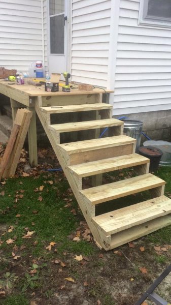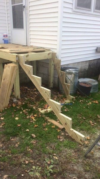 Well I finally found time to make new steps. There isn't anybody around who I can order the length and height from so I ended up making them. Apparently code is 5 step max so thats all anybody carries 3, 4 or 5 step. Online they have the right amount of steps but not the correct rise I needed. Its been a long time since I had to cut stair stringers out.... I nailed it but man thats not something I want to screw up the boards where $$$ at current prices. :whistle: