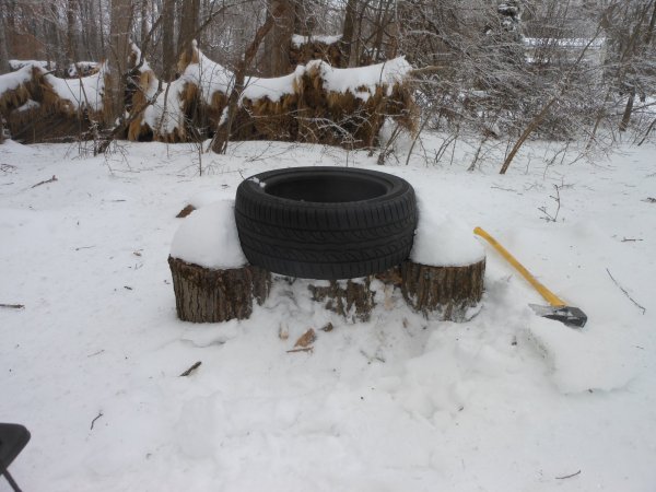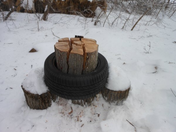 Just another idea to consider. I set my splitting block on a old 4x8 sheet of plywood. Soooo easy to cleanup the leftovers. Good kindling. Not that I need it any longer. Ply has been on the ground for 2 years. Still in decent shape. I store my tire under my utility trailer to keep it dry.