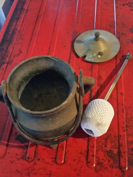 She said it always sat by their fireplace growing up. It had gas logs though. The end of the thing with the handle has like a ceramic ball on the end of it. The top has a notch in it so The handle can hang out of it with the top on. I have no idea what it could be for? She said is it for putting kerosene or diesel fuel on a fire?? I honestly am lost...I am not even sure it goes with a fireplace. Her parents are city people and don't know much about any kind of stuff really.
