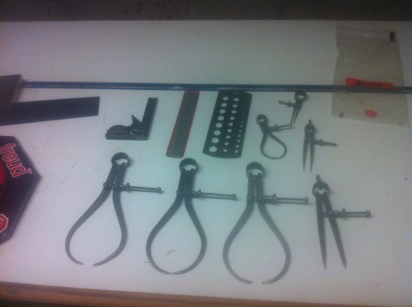 Here's a couple of my latest ebay scores. A few sets of Starrett outside calipers and dividers, Starrett machinist's rule, Starrett drill/wire gauge (which I plan to use as a dowel-making plate), and a 4" Lufkin combination square.