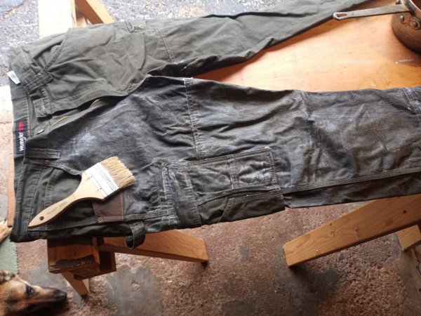 I coated up an older pair of my work jeans, something to be waterproof that's not insulated, for the 40* days. Wrangler Riggs. I'm kinda hoping that this coating will reduce wear in chafe areas. I walk a LOT at work, and yall can guess what parts of any pants wears out first. As close as wax will ever get to the man bits. Few more things learned: News print as a soaking up means, also spreads it thinly too My chip brush melted a bit from the heat gun. Heat gun $40 harbor fright. Ran it for several hours at a time no issues. wax on the brush and running the heat gun got good results on the second coat Use minimal heat on keeping the pot liquid, otherwise some elements of the mix settle to the bottom of the pot. Stirring helped. Good light is useful to see by and if it's sun, to help keep things warm. Warmer weather might be better, but 40 and 50F did well enough my work table had residual dust and wood bits. nothing became part of the wax, but it picked every speck of dust. Some wax, drips or splatter from the brush, made it to the 'table'. I'll gladly deal with stiff clothing before being soaked on a 40* day. Pic: one side coated, other side not. Seems soak up more. Dog on hand to assist and warn me of people movements.