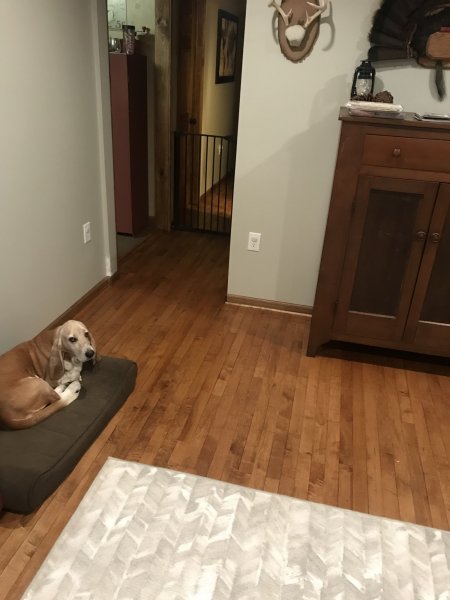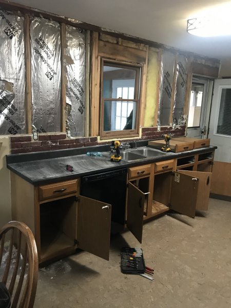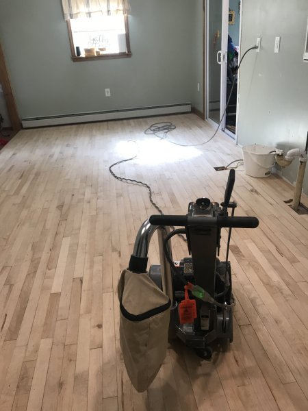 Ok now here’s the new trouble..... The kitchen! The wall behind the sink had brick veneer all over it so easiest thing was to tear out the drywall. New drywall and cabinets all removed. Fresh paint all new plugs, switches, lights and of course more hardwood. Getting ready to fire up the sander this morning. Stain’s a dryin’