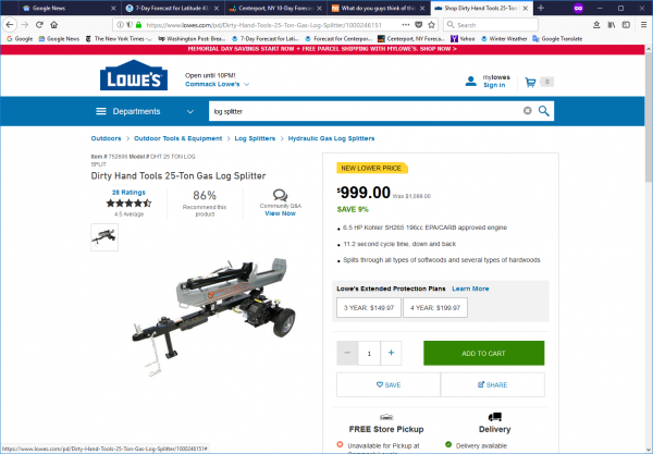 glorth2 just my 2 cents here, as some here have said wait till you see one on sale. TSC has had some at $699 and depending on how big your cutting and splitting, 20 to 25 ton is plenty of power. As nsmaple has said, I would stay away from anything with a Tecumseh motor. I have one with a briggs and one with a Honda, (I built the one with the Honda) but the old Craftsman 20 ton I have with the Briggs is like the Energizer bunny, it just runs and runs! Good oil changes are key. I would keep my eye's on the big box stores, Lowes, Home depot, TSC, Menards "if you have one" and just keep shopping, one will turn up very reasonable.
