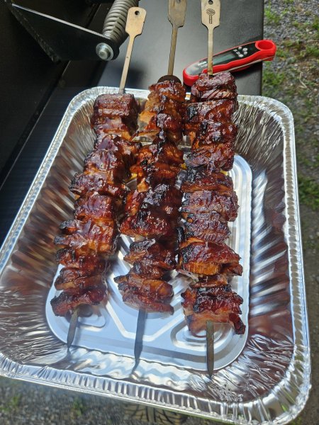 So the skewers are the pork-pork-pork conglomerate (loin, sausage, bacon) in the pan above?? Interesting......