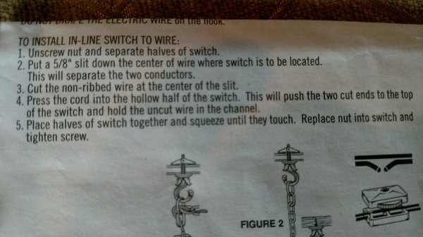 Only thing to remember in installing the switch, do not cut both wires going to the lamp. Just one of them and then connect that wire to each side of the switch.