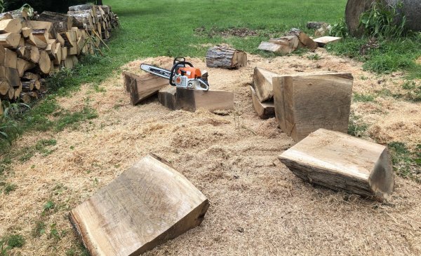 We got a call from the neighbors to the north and they had another huge White Oak fall over. We went over and cut it up for them. John got 8 dump trailer loads and I got 8 dump trailer loads. I put mine by the pallets behind the pines so I can break it down and get it on pallets for the 28-29 heating season. I'll have to get another row of pallets going. There is 48' of pallets there now with the 27-28 season wood on it. This new wood is stretched out about 120' on the ground for now. We had a busy 2 days cutting that tree up and limbing and hauling it home. Probably another 6 or 7 cords in this batch. They have another dead White Oak they want us to drop that we'll probably go get when the ground gets frozen. It'll probably yield more wood than this tree. It's another monster sized tree. I cut a huge limb knot off to give to FHC brother to make some bowls. I hope they can get some use from it. that part of the tree was very solid. The saw is my 357 with a 24" bar on it to give some scale to the size of this branch knot!!! It was a lot of work but fun to work on these big ones.